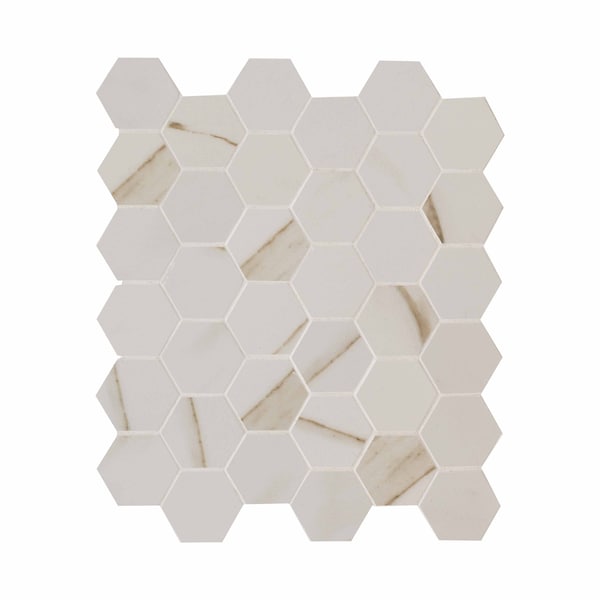 Whether you need to update your outdoor terrace or kitchen backsplash, these MSI Calacatta Hexagon porcelain mesh-mounted mosaic floor and wall tiles are the perfect choice and add a striking accent to your home. these tiles can be used as medium-duty flooring and they are slipesistant wherever you place them. they come in in sections for ease of installation and offer a lovely marble look with stunning whites and warm beige veining that delivers a world class look. this tile features in. hexagon chips on a mesh-mounted mosaic sheet with a smooth finish and can be used for whole floors or wall sections or trimmed to fit your desired need.