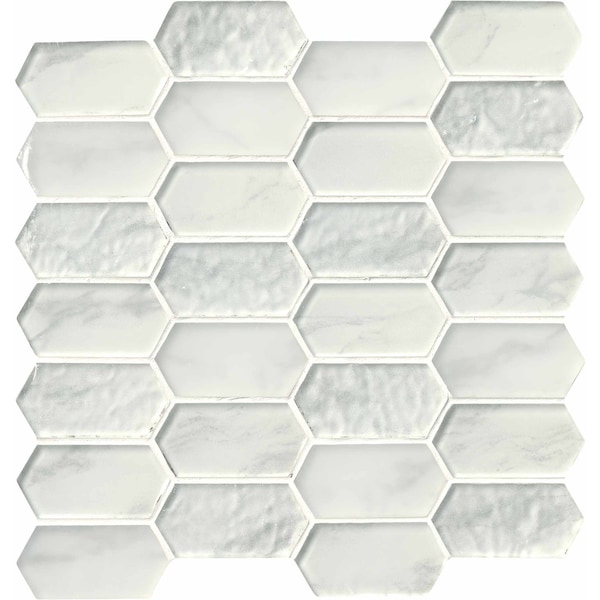 This Calypso Picket pattern glass mosaic tile features crystallized glass, a glossy finish, high sheen and a soft white shade that will add brightness to your home. this tile can be used in your house on bathroom and kitchen walls or countertops and it's frostesistant. installation is quick and easy with the mesh-backing.