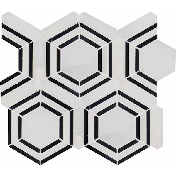 Update your floors, walls, shower surrounds or backsplash with the MSI Carrara Georama Nero mosaic tile. this tile is easy to install as it is mesh-backed with a professional finish. the geometric pattern makes a statement with its white and black marble in charming hexagons giving it a retro style. this design can fit into many existing decor scenes. these tiles are greenguard indoor air quality certified and offer versatility and beauty whether it's in a residential or commercial property. the neutral color makes it easy to blend in yet stand out.
