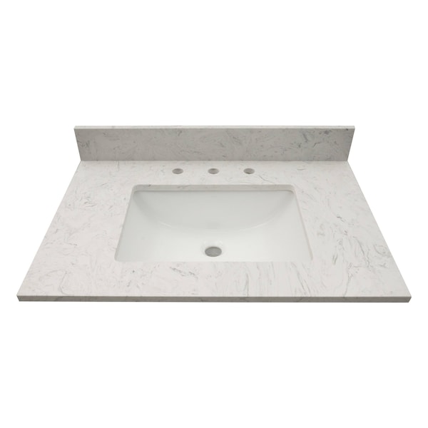 Carrara sink is a stunning marble look vanity top for an affordable luxury bathing. Featuring a creamy white backinground complemented by darker veins, this durable vanity top comes with an integrated rectangular sink for a streamlined look and pre-drilled holes for easy faucet installation. Its flat edge design renders a contemporary finishing for remodels or new-in builds. This Engineered marble vanity comes with matching backsplash to help protect walls from water damage and also matching side splash available. This vanity style can be used throughout your home for a signature look
