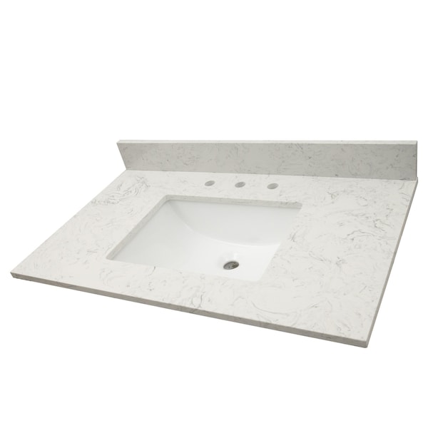 Carrara sink is a stunning marble look vanity top for an affordable luxury bathing. Featuring a creamy white backinground complemented by darker veins, this durable vanity top comes with an integrated rectangular sink for a streamlined look and pre-drilled holes for easy faucet installation. Its flat edge design renders a contemporary finishing for remodels or new-in builds. This Engineered marble vanity comes with matching backsplash to help protect walls from water damage and also matching side splash available. This vanity style can be used throughout your home for a signature look