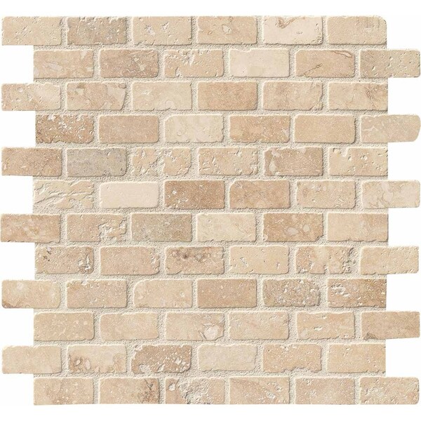 Add sophistication to your home with these chiaro brick tumbled travertine mosaic tiles. they measure and are impressive as each stone has a rustic, old-world charm. they are easy to install and interconnect seamlessly, making large-scale tiling projects look like each brick was laid individually and spaced perfectly. the beige and cream effects of the stones add charm and they are mesh-mounted. these tiles from MSI exhibit random tone variations and coordinate with nearly any commercial or residential decor theme. when using natural stone products, it is recommended to blend tiles from different boxes when installing. after installation, vendor disclaims any liabilities. natural stones may be characterized by dry seams and pits that are often filled. the filling can work its way out and it may be necessary to refill these voids as part of a normal maintenance procedure. natural stone products inherently lack uniformity and are subject to variation in color, shade, finish, etc.