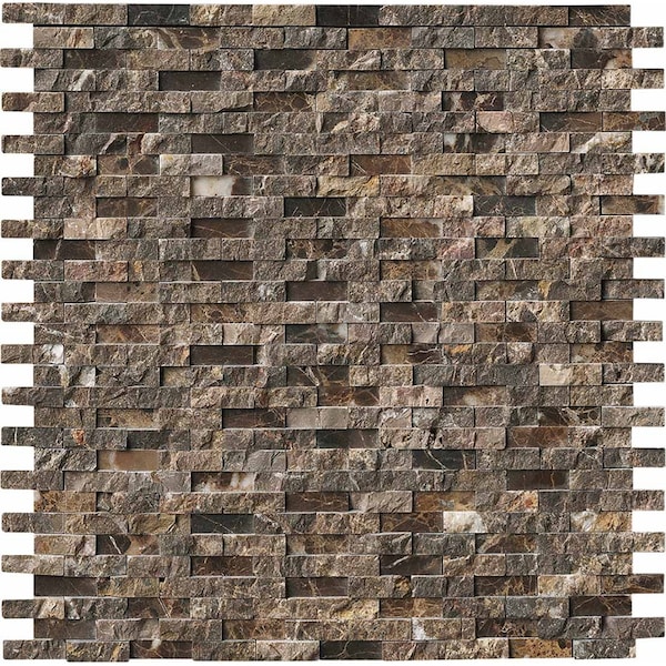 Use these MSI Emperador Split Face brown marble mesh-mounted mosaic tile indoors to create a unique effect with your decor. the tile measures and are natural stone wall tiles with an unglazed finish. the water absorption rate on the tiles is less than 0.5%. note: inspect all tiles before installation. natural stone products inherently lack uniformity and are subject to variation in color, shade, finish etc. it is recommended to blend tiles from different boxes when installing. natural stones may be characterized by dry seams and pits that are often filled. the filling can work its way out and it may be necessary to refill these voids as part of a normal maintenance procedure. all natural stone products should be sealed with a penetrating sealer.