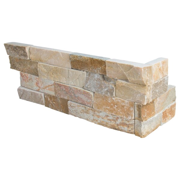 MSI’s Golden White Corner Panel features soft grays, warm golds, and creams which contrast beautifully against rich red tones. Featuring multiple sized rectangular stones in varying thicknesses, this quartzite corner panel adds interest and dimension to any space while its splitface finish offers a natural look. Understatedly elegant, its perfect for finishing off backsplashes, feature walls, fireplaces surrounds, and more. Also frost resistant, this lovely earthy hued corner panel can be used outdoors to give any number of residential or commercial stacked stone projects a designer look.