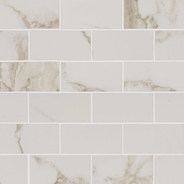 MSI’s Calacatta ivory porcelain mosaic tile features a background of a sweeping white and cream porcelain with darker elegant veins of gray and browns. offering the luxurious look of marble with chips on a mesh-mounted mosaic sheet in a uniquely sized polished tile, calacatta ivory is traditional and contemporary all at once. it's popular with homeowners, designers and builders because it harmonizes sublimely with diverse design aesthetics and it's suitable for many residential applications, including walls, backsplashes and shower surrounds. this stone look tile can also be used in some light-duty commercial applications. this is a rectified tile, mechanically finished on all sides to achieve uniformity. its precise sizing allows for a thinner grout joint, which results in a clean, professional install and reduces staining issues. multiple tile sizes, along with coordinating decorative mosaics give your project a finished look.