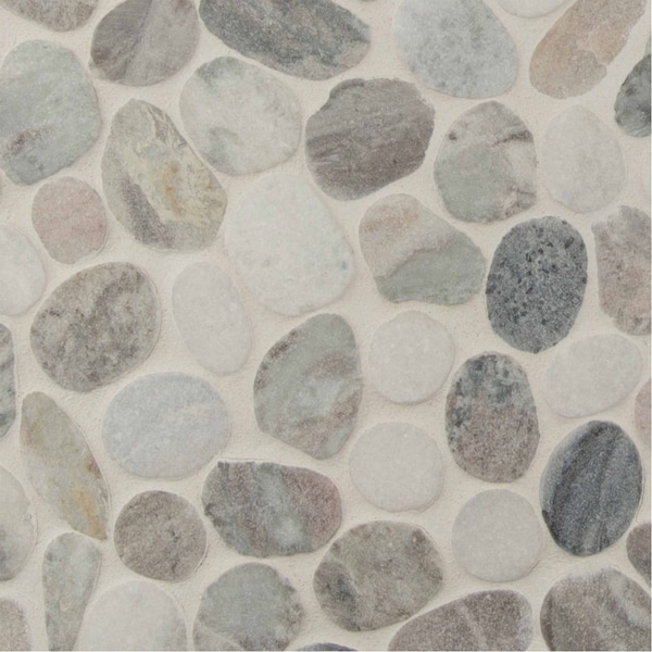 Puebla Greige Pebble . mesh-mounted mosaic is a natural stone marble. this tile has random pieces of flat polished rock mounted on a . mesh sheet for ease of installation. a blend of various shades of gray makes it an attractive option to complement any install in a wide variety of design schemes, including kitchens and bathrooms. note: inspect all tiles before installation. natural stone products inherently lack uniformity and are subject to variation in color, shade, finish, etc. it is recommended to blend tiles from different boxes when installing. natural stones may be characterized by dry seams and pits that are often filled. the filling can work its way out and it may be necessary to refill these voids as part of a normal maintenance procedure. all natural stone products should be sealed with a penetrating sealer.