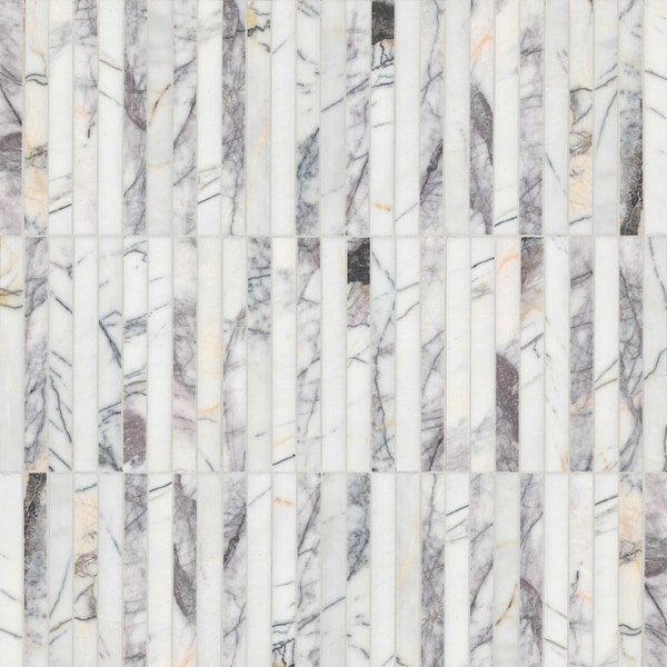 Scollopini Lilac Pattern Mosaic Tile features cool white marble with striking charcoal veins and a unique concave pattern that adds a dynamic touch to any space. The Honed finish enhances its sleek elegance, while the mesh backing ensures easy installation. Perfect for stylish accent walls and backsplashes, this versatile tile brings a modern, luxurious feel to any room with its distinctive design and timeless appeal.