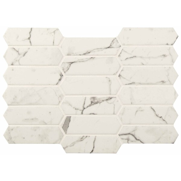 MSI’s Statuario Celano mm Picket recycled glass mosaic tile features a soft white background with gorgeous gray veining. combining of today's hottest trends recycled glass and white marble look there's no better way to give your remodel or new build a touch of timeless luxury. the long, picket look of these tiles visually enlarges even the smallest of spaces. they're suitable for any number of residential or light use commercial applications, including countertops, backsplash, showers walls, and accent walls. pair this traditional yet mod recycled glass mosaic with others from the statuario celano collection for a signature look, or use it alone to headline your design. either way, this marble-look tile is sure to garner attention. tiles are mounted on mesh-backed sheets for a simplified installation that yields a professional look.