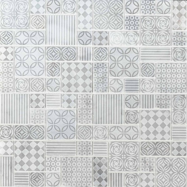 MSI’s Tetris Blanco 0mm marble mosaic backsplash and wall tile features a captivating mix of geometric looks in carrara white marble for signature design statements. the prefect choice for creating visual interest without overpowering, these neutral-hued encaustic-look tiles feature a laser etched design resulting in an engraved surface adding a touch of detail to any space. use them to create a signature backsplash, accent wall, countertop, or to fashion a magazine-worthy shower surround. new installation or renovation, achieving a distinguished of-the-moment look has never been easier. these tiles are mounted on mesh-backed sheets for simplified installation and a professional finish. note: inspect all tiles before installation. natural stone products inherently lack uniformity and are subject to variation in color, shade, finish, etc. it is recommended to blend tiles from different boxes when installing. natural stones may be characterized by dry seams and pits that are often filled. the filling can work its way out and it may be necessary to refill these voids as part of a normal maintenance procedure. all natural stone products should be sealed with a penetrating sealer.