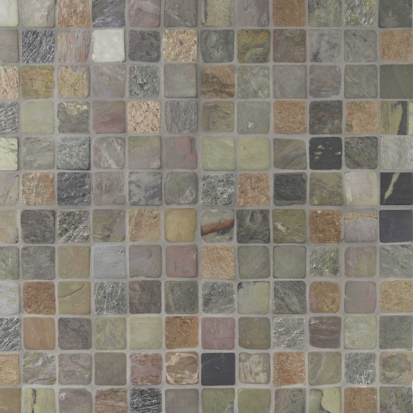 Transform spaces in your home with these multicolored 2 in. x 2 in. Tumbled finish slate brick pieces. they will look great on a kitchen backsplash or a bath wall or even a countertop surface or feature wall. they give an upscale look and are meshed together to form a lovely 12 in. x 12 in. mosaic tile. use them in commercial or residential settings. when using natural stone products, it is recommended to blend tiles from different boxes when installing. after installation, vendor disclaims any liabilities. natural stones may be characterized by dry seams and pits that are often filled. the filling can work its way out and it may be necessary to refill these voids as part of a normal maintenance procedure. natural stone products inherently lack uniformity and are subject to variation in color, shade, finish, etc.