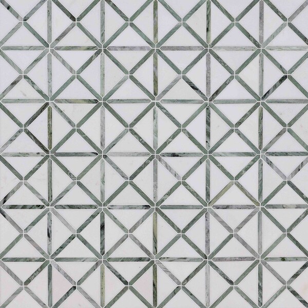 The Verdant Green Geometrica Pattern Tile effortlessly delivers a subtle yet captivating presence, blending shades of cream and tan with geometric green accents. The distinctive pattern of this marble mosaic tile captures attention, lending an air of sophistication and coziness to your space. With its mesh-backed design, this tile offers versatility for both residential and commercial applications, seamlessly complementing various design styles. Whether adorning a small or large bathroom, the kitchen, or any other area in need of style and elegance, this tile is the perfect choice.