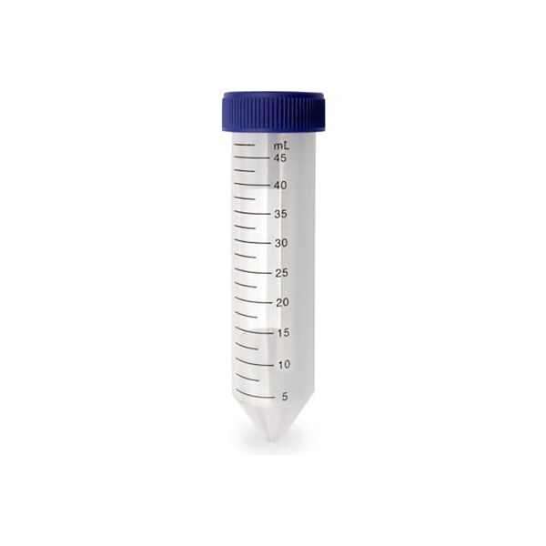 Our 50ml centrifuge tubes are made of premium polypropylene for clarity and centrifugal strength. Tubes and caps may be frozen at temperatures as low as -86 c. The maximum centrifugal force is 15,000xg for the 50ml tubes*. Caps have a flat top surface for easy marking and labelling. C2605 and c2630 feature a 'skirted' bottom that allows the tubes to stand upright without a separate test tube rack. The c2600 series of centrifuge tubes, self-standing or not, are leakproof to 95 kpa/14psi. *refers to liquids with a specific gravity of 1.0, using appropriate rotors, cushions, and adapters. features: sterile, rnase, dnase, pyrogen and cytotoxin free available racked or bagged compatible with standard rotors frosted marking surface