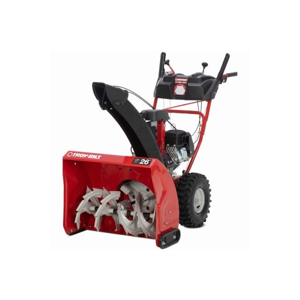 Troy-Bilt 26 2-Stage Gas Snow Thrower 243cc 4-Cycle OHV Engine Push Button Electric Start Installed 26 Clearing Width 21 Intake Height Serrated Auger Design Large 12 Impeller Steel Gears In Cast Aluminum Gear Box 6 Forward/2 Reverse Speeds Single Hand Operation Clutch Lock System Ergonomically Designed Control Panel with Remote Pitch Control Extended Polymer Chute 15 x 5 X-Trac Tires In-Dash LED Headlight Deluxe Skid Shoes 2 QT Fuel Tank Capacity Chute Clearing Device Standard Oil Included In Engine Fully Assembled 3 Year Limited Warranty.
