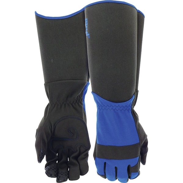 Mens extended sleeve garden glove. Features a synthetic leather palm with a reinforced padded palm that provides excellent abrasion tear and puncture resistance. Keeps your hands safe and protected on the job while also adding durability in a normal high wear and tear area. Brilliant blue color.