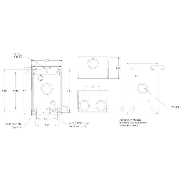 Mulberry; Weatherproof Box; Single Gang; Number Of Outlet: 4; Material: Heavy Duty Die-Cast Aluminum; Size: 1/2 IN Hub; Color: Gray; Cubic Capacity: 18 IN; Outlets/location: (2) One End, (1) Other End, (1) Back; Lugs: No
