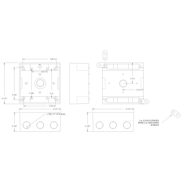 Mulberry; Weatherproof Box; Two Gang Lug; Number Of Outlet: 7; Material: 094 IN Heavy Duty Die Cast Aluminum; Size: 4.500 IN Width X 4.500 IN Length X 2 IN Depth; Color: Gray; Mounting: Detachable Lug; Cubic Capacity: 30.500 CU-IN; Outlets/location: (3) Each End, (1) Back; Hub Size: 1/2 IN