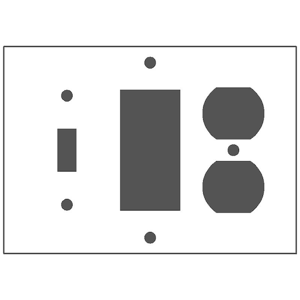Wallplate, Application: Residential, Standard: UL 883, Size: 6.375 X 4.5IN, Number of Gangs: 3, Cutout: (1) Toggle Switch, (1) Block Duplex, (1) Duplex Receptacle, Material: Cold Rolled Steel, Thickness: 0.03IN, Color: Semi Gloss Ivory