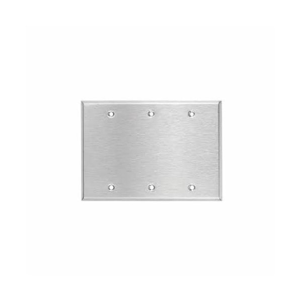 Wallplate, 3.281IN Box Mounting, Satin Finish, Standard: UL 883, Size: 6.375 X 4.5IN, Number of Gangs: 3, Cutout: (3) Blank, Material: 430 Stainless Steel, Thickness: 0.035IN