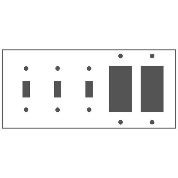Wallplate, Standard: UL, Size: 10.00 X 4.50IN, Number of Gangs: 5, Cutout: (3) Toggle Switch, (2) Block Duplex/GFI Receptacle, Material: Steel, Thickness: 0.03IN, Color: Semi Gloss White