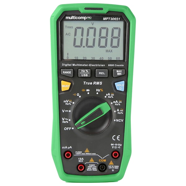 MP730651 from Multicomp Pro is a 1000V true RMS digital multimeter which offers high levels of reliability and security, with a 6000 count display. With a large screen, high resolution analogue pointer display, full scale overload protection and unique appearance design, the device is an extremely practical electrical measuring meter. This device can measure AC/DC voltage/current, resistance, diode, continuity, capacitance, frequency and duty ratio. Also features functions such as data transmission, data hold, relative value measurement, internal temperature alarm, low battery indication, backlight, auto power-off and NCV functions.