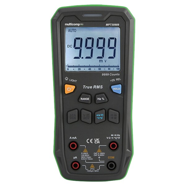 MP730989 is a 9999-count true RMS digital multimeter, with full push-button design and laser-engraving light indication, ii is clearly visible and easy to be operated in dark environments. Smart Digital Multimeter can be used to measure large capacitance up to 99.99mF and automatically identify current input terminal. The meter has multiple features such as overvoltage alarm indication, overcurrent alarm indication, false detection protection for high voltages, etc.
