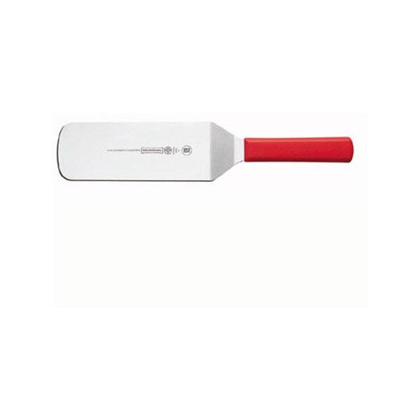 Solid turner; 8 in (L) x 3 in (W); Stainless steel construction; Red polypropylene handle; Treated with sanitized antimicrobial protection; NSF certified