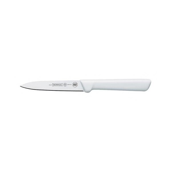 Paring knife; 4 in (L); Spear point high carbon blade construction; Molded white polypropylene handle; Treated with sanitized antimicrobial protection; NSF certified; Sold by pack of 3