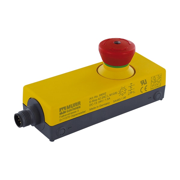 Emergency stop with 2 positive opening, contacts in a IP65 enclosure, illuminated (white LED), M12 connection, 8 poles