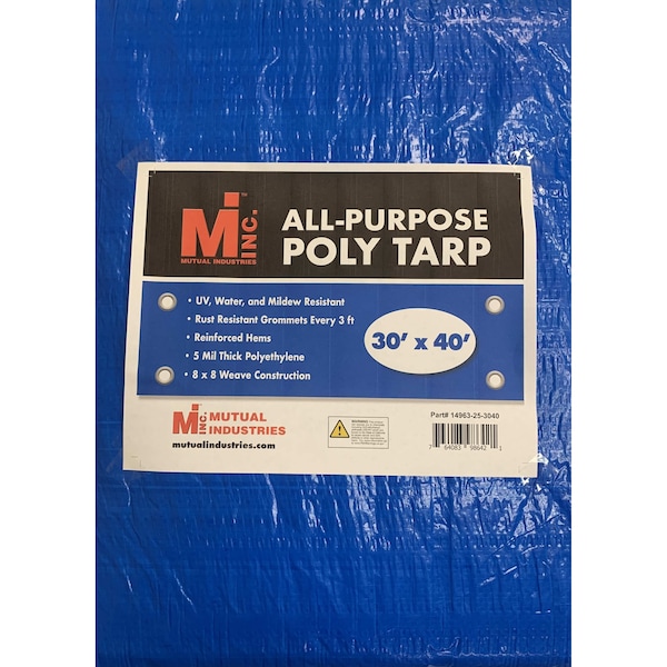 Tarp, 30 ft x 40 ft, 5 Mil, Blue, UV Resistant, Mildew Resistant