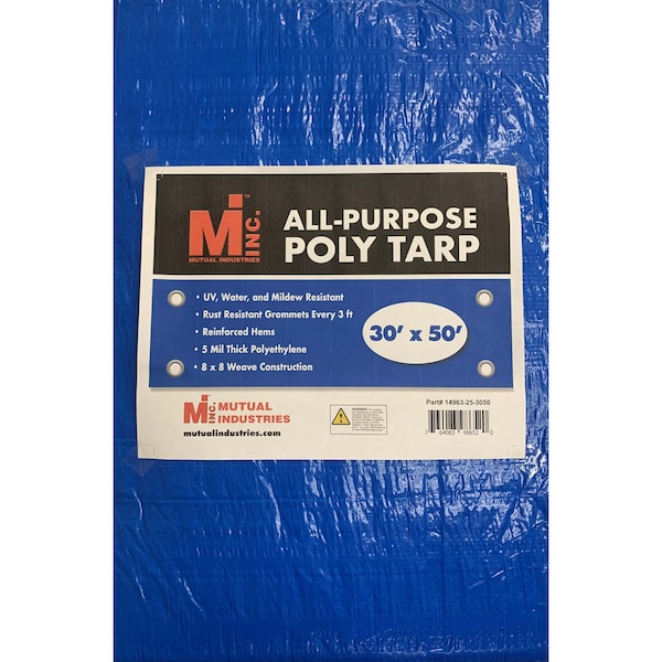 Tarp, 30 ft x 50 ft, 5 Mil, Blue, UV Resistant, Mildew Resistant