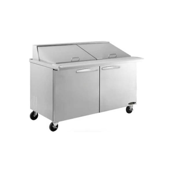 Kool-it kstm-60-2 salad table 60" 2 door - megatop kool-it's 60" mega top sandwich / salad prep unit two-section salad prep table includes a stainless steel top with opening for (24) 1/6 size pans included, cutting board, and (2) epoxy coated wire adjustable shelves. this allow for maximum storage for your ingredients. the easy grip door handle, and stainless steel interior & exterior are superior quality and design. includes heavy duty casters with two front brakes. the temperature range is 32-40f temperature range with a rear mounted self contained refrigeration system.