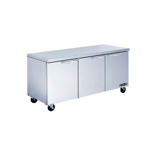 Kool-it kucr-72-3 undercounter refrigerator 72" three door kool-it's undercounter 72" rear mounted self contained refrigerator, includes three-sections, and (6) epoxy coated wire shelves which helps save space in your kitchen, and allows for maximum storage capacity. the easy grip door handle, and stainless steel interior & exterior shows the superior quality and design. includes heavy duty casters with two front brakes.