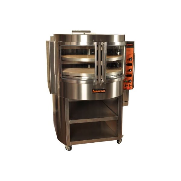 Sierra volare, gas fired pizza oven sierra pizza oven, gas, (2) rotating 38.6" dia. Ceramic decks, (14) 12" pizza capacity, (3) tempered glass doors, temperature adjustable up to 700f, dual digital temperature display, on/off switch to control deck rotations, emergency stop button, (3) individually controlled burners, pressure regulator, stainless steel construction, stand with undershelf & casters included, 115v/60/1-ph, 4 amps, 90,000 btu, ce, cetlus, etl-sanitation