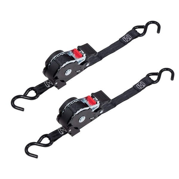 Pack Size: 2 Pack Designed to rewind with just a push of a button for tangle free easy storage. Breaking Strength: 1,500 Lbs Working Load Limit: 500 Lbs. Coated S Hook to prevent scratching cargoFixed End Length: 1 Ft Aprox. Our auto-retract straps incorporate a unique, spring-loaded mechanism inside the steel casing which makes spooling and unspooling easy. NO MORE TANGLED STRAPS. When you unhook the strap, and the ratchet handle is in the "Secure Loading Release position, all 12 feet of strap automatically spools back tight into the steel casing. No loose straps or extra material to deal with. JUST PUSH THE BUTTON. By pushing one button under the handle, you can release the strap so it can be auto-retracted, or you can unspool the exact length of strap you need. EASILY LOCK STRAPS IN PLACE. Once youve ratcheted your straps to the degree of tension your want, easily lock in that tension by setting the handle in the "safety lock notch, which is clearly labelled on the side of the steel casing.STRONG, DURABLE, FLEXIBLE. Our ratchet straps are made of reinforced polyester webbing. Theyre lightweight and designed with strength in mind.STRAP IN MOTORCYCLES, bikes, boats, or anything else you want to transport. A single strap has a working load limit of 500 lbs! And the black-powder-coated S-hook fits over dolly trailer bars and bike handlebars without causing scratches or dings.15-INCH ANCHOR STRAP. The exterior ratchet strap is only 15, letting you secure even fairly small loads precisely.