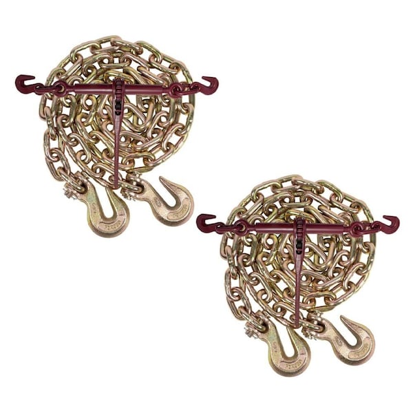 Pack Contains: 2 3/8 in x 20ft Grade 70 transport Chain Grade 70 transportation chain with grab hooks on each end. Working Load Limit: 6,600 lbs. Capacity:26,400 lbs Note: Ratings governed by the National Association of Chain ManufacturersNACM. Also called tow and binder chain, binding chain, boomer chain, load chain, and coil chain. 2 3/8 in - 1/2 in Ratchet Chain Binder Working Load Limit:9,200 Capacity:27,600 Lbs Easy to use and adjust, no snap effect, no recoil Heavy Duty Transport Securement Manufactured with heavy duty forged steel Clearly stamped with Working Load Limit and Capacity Meets FMCSA and DOT Specifications Note:Ratings governed by the National Association of Chain ManufacturersNACM.