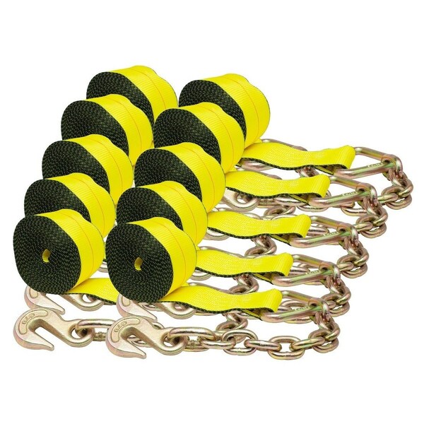 Pack Size: 10 PackWinch Strap : 4in Webbing with Chain Anchor and Webbing - 40 ft.All winch straps are made from resin-coated polyester for minimum stretch and maximum wear resistance. These rugged straps provide the strength and durability demanded in flatbed tie-down requirements. All winch straps are labeled with their working load limit to meet the DOT regulations and WSTDA recommended standards.Working Load Limit:5,400 lbsCapacity: 16,200 lbs.Color: YellowEnd Hook Type: Grab HookGrab Hook Size: 3/8inHook Material: G70 Structural SteelEnd Anchor Chain Material: 20Mn2 Steel