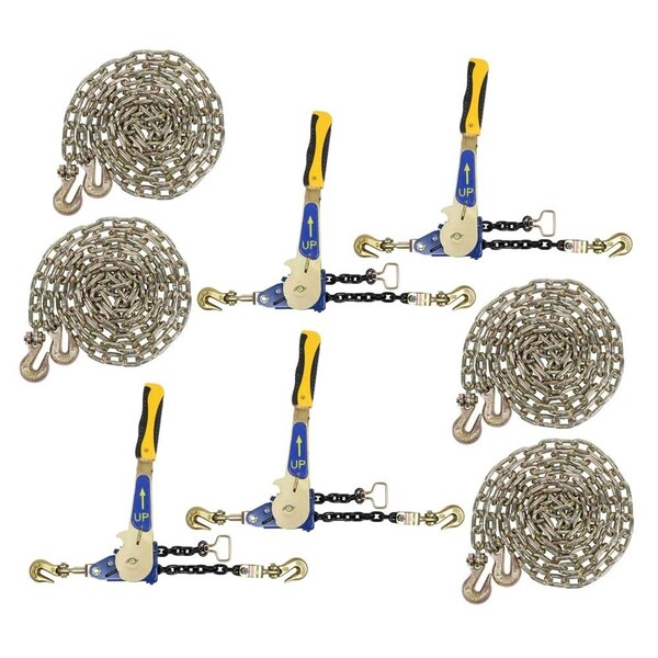 Pack Contains:4 Pcs 5/16in x 20ft G70 ChainGrade 70 transportation chain with grab hooks on each end.Working Load Limit: 4,700 lbs.Capacity: 18,800 lbs.Note:Ratings governed by the National Association of Chain ManufacturersNACM.Also called tow and binder chain, binding chain, boomer chain, load chain and coil chain.4 Pcs Easy Binder Ratcheting Chain Load BinderWorking Load Limit: 5400 lbsAdjustable Range: 1 ftSize: 5/16in Grade 70 or 3/8in Grade 43Quality grade 100 load chain is used in binder.Will take up to 12in of chain during tensioning.Use with 5/16in Grade 70 chains or 3/8in Grade 43 binder chainsDual solid gears distribute tensioning force evenly.