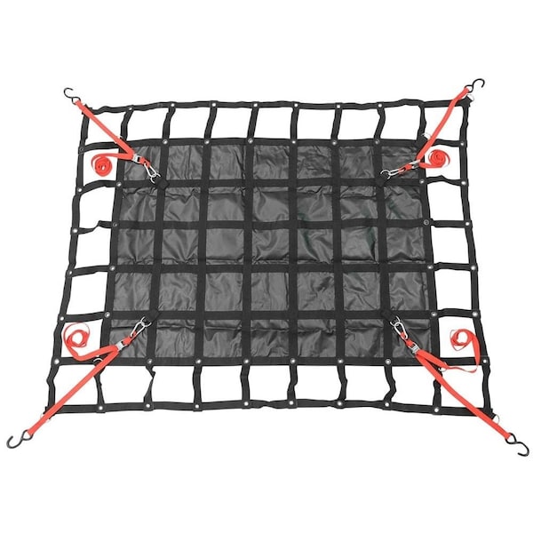 Heavy Duty Cargo Nets Size: 8. 75ft x 10ft Materials: 18oz Vinyl and Heavy Duty Cargo Netting 4-D-Rings on each corner of the Cargo Net For Tie-Down Max Working Load Limit on Tie-Down Straps: 1300 lbs S-Hooks and Ratchets Straps are Red for Visibility Carrying Case