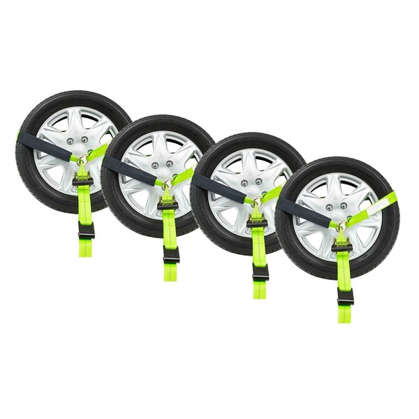 Heavy Duty 2 in x 8ft Tie Down Side Mount Wheel Strap With Flat Hook High Visibility Green Webbing For Safety and Reflective for Extra Visibility in Low Light Conditions Sold In Sets Of 4 Pieces 3333 lbs WLL 10,000 Breaking Strength HIGH-VISIBILITY STRAPS. Our straps are bright, high-visibility green and are reflective in low light for increased safety. DURABLE POLYESTER WEBBING. Our straps are made of durable polyester webbing. Polyester webbing barely stretches at all under heavy loads, it resists taking damage from scrapes or cuts, and water slides right off it--so mildew cant grow and ruin it. CORROSION-RESISTANT RATCHET AND O-RINGS. Our ratcheting mechanism and O-ring connection point are plated with gold chromate, so the heavy-duty steel wont rust or take damage from other metals. HEAVY DUTY FLAT HOOK END FITTING. Flat hooks are compatible with any flat anchor points, including stake pockets on the side of a trailer bed. They can also be compatible with an L-Track anchor system if you incorporate a flat-hook receiver. Our flat hooks are made from heavy duty steel and and sustain a high working load limit. LONG RATCHETING HANDLE. The long ratcheting handle gives you more leverage than shorter handles, so its easier to reach the degree of tension you want. More tension with less force? You got it.