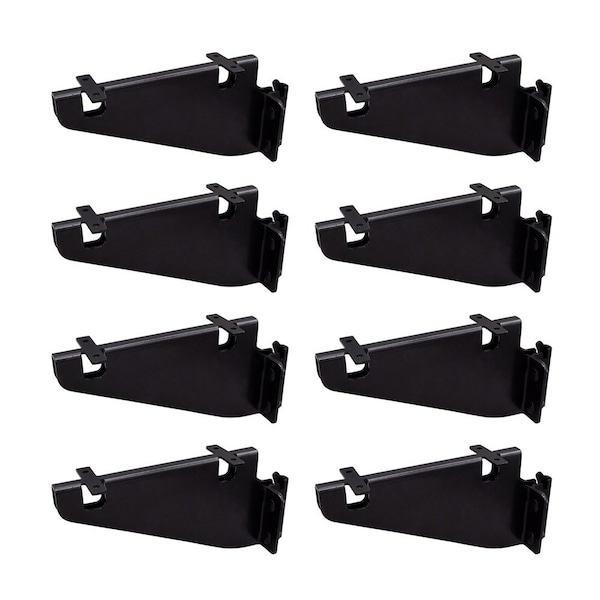 Pack Size: 4 Pack / 8 PcsSpace-Saving Solution: These E-Track fixed shelf brackets enable you to store cargo on wooden shelves, freeing up precious floor space. Your workspace will stay organized, and you'll have easy access to your tools and equipment.Flexible: These E-Track shelf brackets work in trailers, trucks, garages, and warehouses. You can move the brackets on the E-Track to fit your storage needs in your trailer or remove shelves entirely as your trailer storage and organization need to evolve.Precision Design: Two durable steel E-Track brackets with Black Powder Coating to resist rust; each bracket is 7-9/16 inches deep with bolt holes spaced 1-5/16 inches apart; a 12-inch wide board is needed for installation board not included; you'll need 8 screws, each 3/16 inch screws not included.Function: With the E-track fixed shelf track brackets, you can increase the functionality of your trailer and add more storage space while maintaining security and safety. You can also lay any wooden plate on top of the stand.Steps of Installation:Attach the Spring Fitting: Begin by securing the spring fitting to the bracket. Use screws to firmly attach the spring fitting to the bracket. This ensures a stable and secure connection between the two components.Position on E-Track Rails: Once the spring fitting is securely in place on the bracket, position the assembled bracket onto the E-track rails where you want to install it. Ensure it aligns with the desired height and location for your storage needs.Snap into Place: With the bracket in position on the E-track rails, simply press and snap the spring fitting into the E-track. This action locks the bracket securely in place. You now have a sturdy and adjustable mounting point for your shelving or cargo storage.