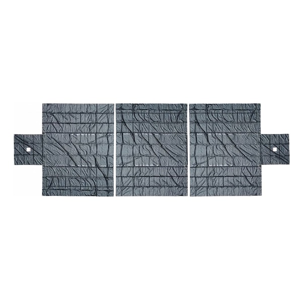 Set Consists of 3 Pieces End Pieces: 24 ft. x 18 ft with 8 Ft Drop, 8 ft x 8 ft Tail and 8 in Rain Flaps; 73 Lbs each Mid Piece: 24 ft x 18 ft; 66 Lbs Fabric: Made with Heavy Duty 18 Oz. Vinyl Seams: Heat-sealed seams make the tarps 100% waterproof Hems: All hems re-enforced with 2 in webbing and double stitched for extra strength Grommets: Tough solid toothed brass grommets clinched every 2 Feet D-Rings: Three rows of inD in Rings box stitched with protection flaps so the hooks from bungee straps don ftt damage the tarp All D-Rings are galvanized with zinc plating. Cold Crack: -40 Degrees C Color: Black Thickness: 21 mil