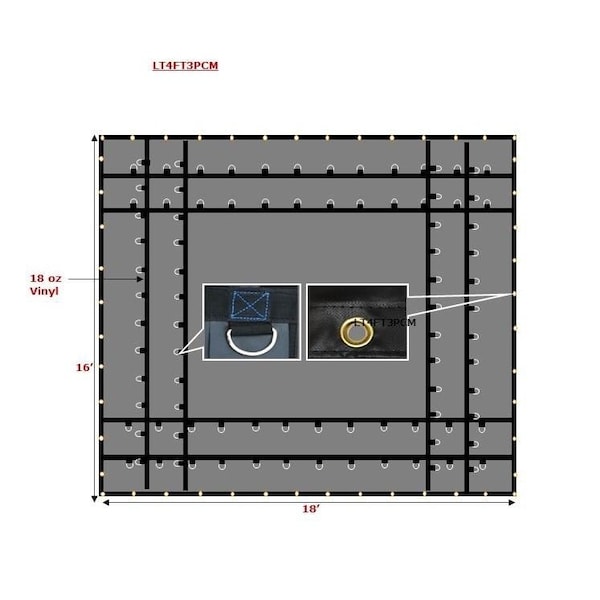 Mid Piece: 16ft x 18ftFabric: Made with Heavy Duty 18 Oz. VinylSeams: Heat-sealed seams with stitched webbing and box stitched D-RingsHems: All hems re-enforced with 2inin webbing and double stitched for extra strengthGrommets: Tough solid toothed brass grommets clinched every 2 FeetWeight: 47 LbsD-Rings: Two rows of ininDinin Rings box stitched with protection flaps so the hooks fromAll D-Rings are galvanized with zinc plating.bungee straps don't damage the tarpCold Crack: -40 Degrees CColor: BlackThickness: 21 milAll tarps are marked with manufacturer information for traceability and identification.