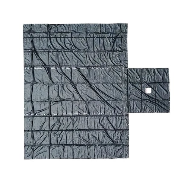 End Pieces: 18ft x 24ft with 8 Ft Drop, 8ft x 8ft Tail and 8 in Rain Flaps; 69 Lbs each Fabric: Made with Heavy Duty 18 Oz. Vinyl Seams: Heat-sealed seams make the tarps 100% waterproof Hems: All hems re-enforced with 2 in webbing and double stitched for extra strength Grommets: Tough solid toothed brass grommets clinched every 2 Feet D-Rings: Three rows of D Rings box stitched with protection flaps so the hooks from bungee straps don't damage the tarp All D-Rings are galvanized with zinc plating. Cold Crack: -40 Degrees C Color: Black Thickness: 21 mil All tarps are marked with manufacturer information for traceability and identification.