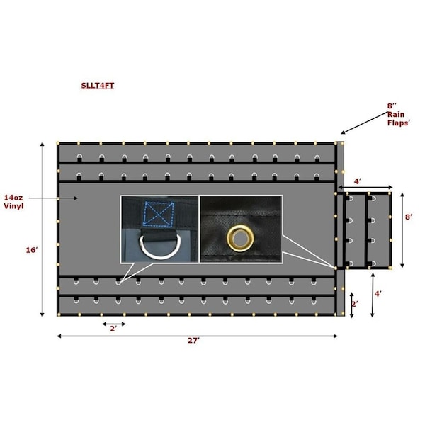 Dimensions: 16ft x 27ft with 4ft FlapHems: All hems re-enforced with 2in webbing and double stitched for extra strengthGrommets: Tough solid toothed brass grommets clinched every 2 FTinDin Rings: Two rows of inDin Rings box stitched with protection flapsAll D-Rings are galvanized with zinc plating.Fabric: Made with Super Light 14 Oz. vinylApplication: For use with flatbed trailers up to 52ft in lengthBase Cloth: 1000 x 1000 Denier / 18ft x 18ftCold Crack: -40 Degrees CWeight: 55 lbsThickness: 17 milAll tarps are marked with manufacturer information for traceability and identification.