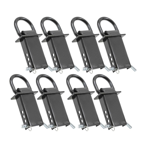 Pack Size:8 Pack STRONG: Our stake pocket D-Rings are forged steel with a black powder coated finish. Each stake pocket D-ring has a working load limit of 5,400 lbs. Capacity is 16,200 lbs. Do not exceed Working Load Limit. PRECISE PLACEMENT: Provides a D-ring exactly where you need it on your trailer. Each stake pocket D-Ring comes with a 1⁄2 hitch pin w/ locking cotter pin and 4 pin holes, so you can adjust the height of your Stake pocket D-ring to fit your current load. FITS MOST STAKE POCKETS: Not all stake pockets are identical. Designed to be compatible with standard 2 x 4 stake pockets. This includes common flush and outside stake pockets. Please be sure to measure before you purchase. DIMENSIONS: 5.5. Tall from the bottom of mounting plate to the bottom of the anchor.3-3/8 Wide.5 from bottom of the mounting plate to the top of the 4th pin hole. 4.25 from bottom of the mounting plate to the top of the 3rd pin hole.3.5 from the bottom of the mounting plate to the top of the 2nd pin hole.2.75 from the bottom of the mounting plate to the top of the 1st pin hole.Bent pin is 6-3/4in long and the clip is 3in long that goes inside it.RESILIENT:Our stake pocket D-Rings are black powder coated to resist scratches, dings, and rust.VERSATILE: D-Rings can be utilized as anchor points for a wide variety of hooks and end-fittings. D-Rings can be used to anchor grab hooks, j-hooks, S-hooks, shackles, and even tow hooks fit onto the ends of ratchet straps, winch straps, or chain binders.