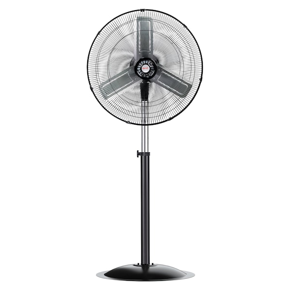 This 24in high velocity air circulator is for indoor use, and has three different speeds, from a gentle breeze to a blast. With 90 degree oscillation and height adjustment for upward & downward airflow. With rigid round base, grills and blades made of metal. With one-year warranty.