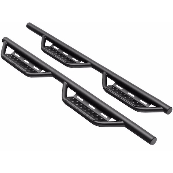 With Drop Down Steps, 2 Inch Round Bent, Black Textured Powder Coated, Steel, Without End Caps, Rocker Panel Mount