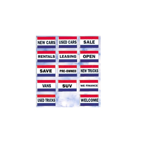 Made of red, white and blue nylon. These 100% nylon flags have heavy bleached cloth headings with two strong brass grommets. Printed in black ink on one side only. 14 messages to choose from.