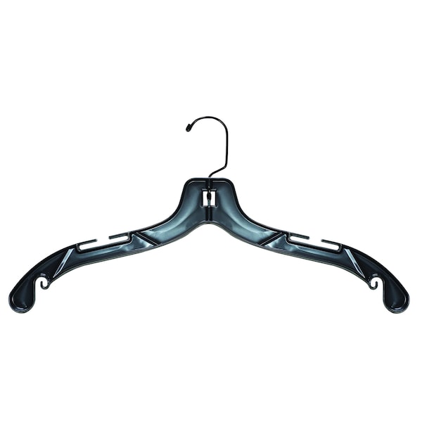 - 17" Black plastic hanger good for hanging top pieces like shirts, dresses, blouses, sweatshirts, sweaters, light jackets, and other light to middle weight garments