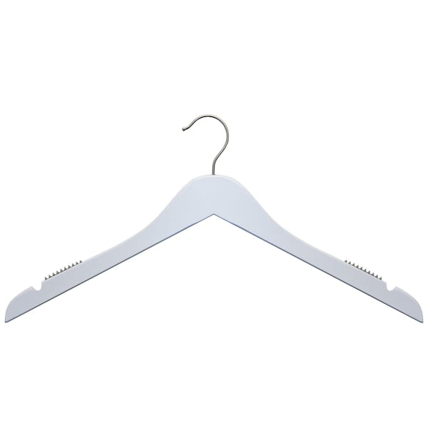- 17" low gloss white finish hanger good for hanging all top pieces like shirts, blouses, dresses, sweatshirts, jackets